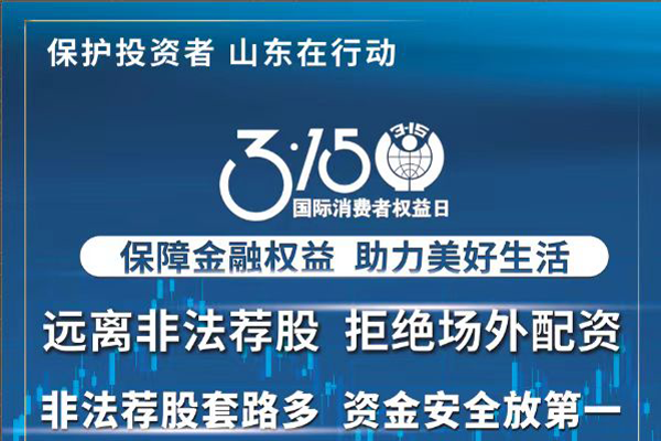 2020年“金融知识普及月”活动,山东证监局提醒您:1. 理性投资 远离非法证券期货陷阱;2. “炒新”有风险,投资需谨慎;3.心莫贪 擦亮眼 崩根弦 防诈骗;4.树立理性投资理念,增强风险防范意识 ;5.选择合适理财产品…